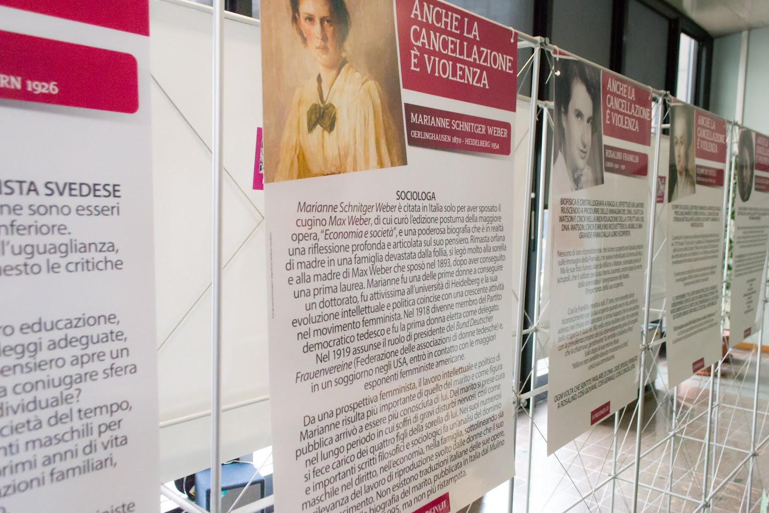 Per “Anche la cancellazione è violenza”, invece, si tratta di un ritorno nei locali di viale Aldo Moro: allestita in Assemblea la prima volta nel 2016, fu riproposta aggiornata e arricchita di materiali nel 2021. Ora torna con nuovi quattro pannelli realizzati dalle studentesse e dagli studenti del Liceo Fermi di Bologna. Realizzata dal Collettivo RivoltaPagina, nei suoi 50 pannelli, la mostra raccoglie le storie di donne dimenticate che, però, hanno dato un contributo decisivo alla scienza, alla fisica, alla letteratura e alla cultura in generale. Un modo per abbattere gli stereotipi di genere e ridare onore e memoria a tutte le donne tagliate fuori dai libri di storia, recuperandone la memoria. Un esempio è quello di Rosalind Franklin, scienziata inglese, vissuta all’inizio del secolo scorso, che ha scoperto la forma elicoidale del DNA, senza, però, mai ottenere il riconoscimento formale della scoperta.