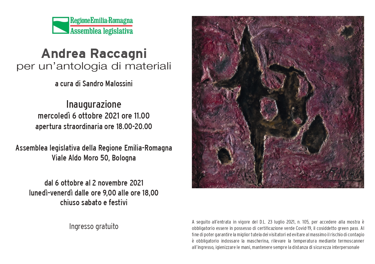 Nel centenario della nascita di Andrea Raccagni, l’Assemblea legislativa della Regione Emilia-Romagna organizza e promuove una mostra a lui dedicata dal titolo “Andrea Raccagni 1921-2005. Per un’antologia di materiali”, a cura di Sandro Malossini, che sarà allestita negli spazi espositivi di viale Aldo Moro 50 da mercoledì 6 ottobre a martedì 2 novembre.